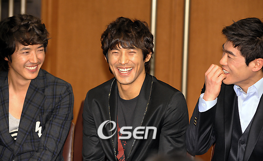 새 MBC 월화드라마‘내조의 여왕’(박지은 극본, 고동선 연출 9일 첫 방송 예정) 제작발표회가 4일 서울 중구 충무로 신세계 본점 문화홀에서 열렸다.‘에덴의 동쪽’후속으로 방송될‘내조의 여왕’은 김남주-오지호, 이혜영-최철호, 선우선-윤상현 등 서로 다른 세 부부의 리얼한 일상을 그리며 다른 색깔의 내조를 그린 드라마다. 윤상현 오지호 최철호가 기자회견을 하던 중 환하게 미소짓고 있다./민경훈 기자 rumi@osen.co.kr