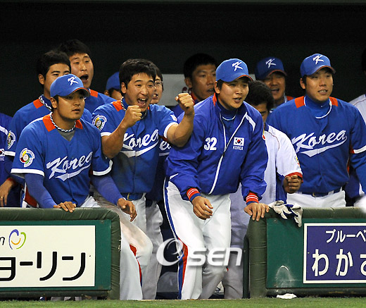 제2회 월드베이스볼클래식(WBC) 1라운드 A조 1,2위 순위결정전 한국-일본 경기가 9일 도쿄돔 구장에서 열려 한국이 선발 봉중근의 5⅓이닝 호투와 중간계투진의 완벽한 투구, 김태균의 적시타로 1-0으로 승리 일본에 콜드게임 패배의 빚을 갚았다.9회말 2사 오가사와라의 타구가 1루 땅볼로 굴러가자 선수들이 긴장된 모습으로 지켜보고 있다./도쿄돔=김영민 기자ajyoung@osen.co.kr