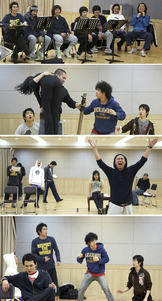 모처럼 ‘무비컬’ 다운 뮤지컬의 등장이 기대를 모은다. 10년 만에 귀환한 영화 ‘주유소습격사건’이 더 화끈하게 뮤지컬로 돌아와 새로운 변신을 시도했다. 지난 11일 오후 2시 30분 서울 백암아트홀에서 열린 ‘주유소습격사건’의 프레스 콜에서 김달중 연출이 1년 동안 작업해온 해프닝 무비컬 ‘주유소습격사건’의 하이라이트 장면이 공개됐다. IMF시절 어려운 경제 속에서 모처럼 숨통 트이게 했던 영화 ‘주유소습격사건’은 10년 만에 화려한 ‘하이테크’ 영상무대의 옷을 입고 뮤지컬로 돌아왔다. 손무현 작곡의 대중적인 록 발라드는 감미로운 음색으로 드라마를 한층 강화했고 영화의 한계를 뛰어넘어 살아 숨 쉬는 생생한 뮤지컬로 국민들의 한숨을 한방에 날릴 확실히 무장한 무대를 선사했다. 종전, 영화를 넘어서지 못하는 몇몇 영화원작 뮤지컬로 인해 ‘무비컬’ 자체가 일반 대중들에게 나쁜 뉘앙스로 받아들이지 않을까 우려도 있었다. 하지만 새롭게 등장한 ‘주유소 습격사건’은 기존의 ‘무비컬’에 대한 의심을 한방에 날렸다. 무비컬 형식 자체가 문제의 원인이 아니라는 것을 당당히 보여주는 사례가 된다. ‘주유소 습격사건’의 연출 포인트는 크게 세 가지다. 첫째는 뮤지컬인 만큼 대중적인 음악으로 관객을 사로잡는 것, 두 번째는 무대와 영상이 만나 뮤지컬 무대의 한계를 뛰어넘는 작업, 세 번째는 주연의 비중을 낮춰 모든 등장인물의 캐릭터에 개성을 부여한 것이다. ‘해드윅’ ‘쓰릴미’ ‘김종욱 찾기’ 등의 연출가 김달중이 지휘봉을 잡았다. 음악은 대중가수들의 곡을 작곡하고 드라마나 영화음악 분야에서 활약한 손무현이 자신만의 음색으로 100% 라이브 록 발라드로 배경을 깔았다. 뮤지컬 무대의 한계는 입체영상의 특수 장치를 설치해 영상에 익숙한 세대들의 입맛을 맞춰 색다른 무대를 연출했다. 게다가 ‘해프닝 뮤지컬’이란 새로운 장르를 도입해 공연장 좌석 중 일부를 철거하고 객석을 재배치하는 이색공간도 마련했다. 공연장 좌석의 재배치는 객석과 무대를 허무는 해프닝의 장소로 활용된다. 사방에서 등장하는 배우들은 ‘이색공간’의 관객에게 당당히 스킨십을 시도하고 배우의 연기 속에 끌어들인다. 김달중 연출이 조심스레 펼쳐 보이는 해프닝 무비컬 ‘주유소습격사건’은 3월 12일 본격적인 관객몰이에 나서면서 무비컬에 새롭게 시도된 장치들을 공개한다. 이 작품이 마지막으로 풀어내야 할 숙제는 아직 공개되지 않은 전체 스토리에 있다. 영화의 전체 스토리를 어떻게 풀어냈는지가 마지막 관건이다. 자타가 공인하는 작품 해설력을 지닌 김달중 연출의 ‘무비컬’ 탄생을 기대해본다. 해프닝 무비컬 ‘주유소습격사건’은 3월 12일 백암아트홀에서 공연된다. jin@osen.co.kr 해프닝 무비컬 ‘주유소습격사건’의 연습현장.