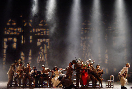 [리뷰] 가슴 깊이 솟구치는 슬픔의 역사…극단 창파의 ‘동녀의 봄’ 여기저기 시체가 널브러져 있다. 끔찍한 전쟁터의 처절한 참상이 눈앞에 펼쳐져 있다. 존재하지 않는 역사를 기억을 되짚어 보며 끄집어낸 무대는 붉은 피가 솟아오르는 애잔한 슬픔으로 밀려온다. 역사는 존재하지 않는다. 오직 기록에 의해서만 기억될 뿐이다. 기억을 되돌려 역사를 무대에 올린 극단 창파, 채승훈 연출의 ‘동녀의 봄’은 죽은 자들이 살아 움직이며 그들만의 언어로 이야기를 한다. ‘죽음의 언어’로 배우들이 ‘꺽꺽’ 소리 지르며 경직된 몸짓으로 극을 전개한다. 일상적이지 않은 연극의 무대는 순차적이지도 논리적이지도 않다. 기억 속에 역사는 관객들을 혼란스럽게 만든다. 사건의 인과관계를 생각하지 않고 내던져진 극의 구성들은 무대를 해석하려하는 관객에게 더 이상 세심한 배려는 하지 않는다. 연출가 채승훈은 ‘동녀의 봄’ 1차와 2차 공연을 통해 관객들이 친숙하고 흥미롭게 작품을 볼 수 있도록 몇 가지 소통하는 장치를 적용했다. 이 작품은 구체적인 대사나 스토리가 존재하지 않는다. 연출가는 이미지와 동작만으로 구성된 무대에서 장면과 장면 간, 배우와 배우 간의 유기적 연결들을 탄탄하게 구성하려 노력했다고 밝혔다. 이것은 곧 이해되지 않은 어려운 부분에 틈틈이 연결고리를 넣어 자연스레 풀어냈다는 말이다. 결과적으로 관객이 편안한 마음으로 부담 없이 감상하길 바라는 연출의 배려다. 실지로 작품을 해석하려 하거나 읽어내려 해서 캐릭터를 분석하고 무대에 요소들을 찾으려 한다면 연극의 흐름을 놓쳐 작품 자체를 느끼기 어려운 상황에 몰린다. 따라서 관객은 보이는 그대로, 들리는 그대로 무대 위에 연출된 극을 감상하면 된다. 배우들의 몸짓 하나로 자연스레 감춰졌던 우리 민족적 수난의 고통이 붉게 물든 무대만큼이나 가슴 저리게 다가온다. 연극은 타데우즈 칸토르(Tadeusz Kantor)의 작품 ‘빌로폴 빌로폴’을 한국적으로 바꿔놨다. 이 작품을 한국적으로 각색한 채승훈의 '동녀의 봄'은 폴란드의 짙은 색을 한국적인 색으로 입혀냈다. 처음부터 폴란드의 외세 침략이나 민족 분열 등의 비극적 역사를 한국적으로 바라보며 한국무대에서 한국관객에게 다가가기 위한 작업을 시도했다. 그 접근 방법을 우리민족의 한을 어머니의 인생에 극단적으로 축약해 표현했다. 1-2차 공연에서 젊은 관객들에게 이해의 폭이 좁아 아쉬웠던 연극은 좀 더 짙은 색채의 감각적인 무대와 드라마를 극적으로 확장시키는 사운드를 더해 감상위주의 연극으로 선보였다. 그야말로 눈으로 보고 귀로 들었을 때, 가슴 속 깊이 울려퍼지는 울음 소리에 눈물을 흘리는 작품이다. jin@osen.co.kr 연극 '동녀의 봄'.