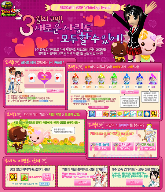 오늘날 게임을 통해 사랑의 결실을 맺은 사람들을 찾아보는 것은 어려운 일이 아니며, 게임으로 여가를 함께 즐기는 커플도 늘어나고 있다. 이러한 현상을 반영하듯 테일즈런너의 커플시스템을 통해 커플을 맺은 유저들은 약 20만쌍에 이르며, 지난 2월에는 커플시스템의 강화, 확대 버전인 결혼시스템이 업데이트 되기도 하였다. 커플간 사랑을 확인하고, 고백을 할 수 있는 적기인 화이트데이를 기념하여 ㈜나우콤(대표 김대연, 문용식)이 서비스하고 ㈜라온엔터테인먼트(대표 박재숙)가 개발한 캐주얼게임 ‘테일즈런너’(http://tr.nopp.co.kr)는 다채로운 화이트데이 이벤트를 3월 13일부터 실시한다. 먼저 유저들은 홈페이지를 통해 자신이 선물하고 싶은 티셔츠를 고른 후 커플룩을 함께하고픈 연인, 친구의 닉네임을 입력하고, 구매하기를 클릭하면 할인된 가격으로 커플룩을 구매할 수 있다. 고백을 할 사람이 없다면 테일즈런너의 인기스타 삐에로(테일즈런너 GM)에게 고백하면 된다. 7명의 삐에로 중 고백하고 싶은 삐에로를 선택. 지급목록 아이템 중 삐에로에게 받고 싶은 선물이나 하고 싶은 말을 입력하면 해당아이템을 증정한다. 또, 테일즈런너 커뮤니티 공간 ‘공원’에서 중앙 광장에 있는 커플삐에로를 클릭하면 게임 속 나만의 공간 ‘테일즈 팜’에 설치 가능한 대형사탕과 초콜릿 인형을 선물할 수 있다. 이와 함께 신학기 맞이 이벤트가 진행되고 있다. 유저들은 새학년, 새친구들과 함께하는 투표, 출석체크, 댓글이벤트를 통해 테일즈런너 캐시를 획득할 수 있으며, 친구들과 함께 게임을 플레이하는 즐거움은 기본이다. 나우콤 심진식PM은 “9주 연속 업데이트로 더욱 재미있어진 테일즈런너에서 2009년을 함께할 사람에게 고백도 하고, 아름다운 사랑도 만드시길 바란다”고 밝혔다. 자세한 사항은 테일즈런너 공식 홈페이지(http://tr.nopp.co.kr))에서 확인할 수 있다. 영상으로 만나는 게임 세상 - 게임무빙닷컴제공 보도자료 bodo@gamemoving.com OSEN 엔터테인먼트팀 osenstar@osen.co.kr