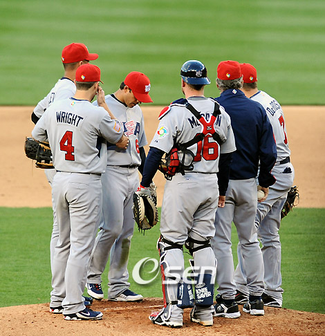 실책이라는 예기치 않은 변수가 메이저리거들을 무릎 꿇게 했다. 탁월한 힘과 개인 기량을 자랑하는 메이저리거들로 선수단을 구축한 미국과 베네수엘라가 모두 실책으로 인해 패퇴하고 말았다. 미국은 23일(한국 시간) 일본과의 WBC 4강 전서 4회 브라이언 로버츠가 저지른 실책을 이겨내지 못하고 4-9로 패했다. 전날 실책 5개를 저지르며 한국에 2-10으로 대패한 베네수엘라에 이어 단기전서 '수비력의 힘'이 얼마나 중요한 지 알려주는 경기가 되었다. 1회초 선두타자 솔로포로 기세를 올렸던 브라이언 로버츠(32. 볼티모어)의 4회 실책은 너무도 뼈아팠다. 로버츠는 4회말 무사 1,2루서 후쿠도메 교스케(31. 시카고 컵스)의 2루 땅볼 성 타구를 놓치며 2-2 동점 허용의 장본인이 되었고 이는 4회 5실점으로 이어졌다. 마치 22일의 바비 아브레우(35. LA 에인절스)를 보는 듯 했다. 아브레우 또한 1회초 정근우(27. SK)의 플라이성 타구를 어이 없이 놓치며 득점 찬스를 내줬고 이는 김현수(21. 두산)의 선제 적시타, 추신수(27. 클리블랜드)의 쐐기 중월 스리런까지 이어지는 단초를 제공했다. 베네수엘라는 22일 경기서 총 5개의 실책을 저지르며 대패, 4강에 올랐다는 데에 만족해야 했다. 좌익수 자리가 익숙했으나 우익수로 출장한 애덤 던(30. 워싱턴)의 안일한 수비 또한 아쉬웠다. 4회 이와무라 아키노리(30. 탬파베이)의 우익수 방면 타구 때 중견수 쪽으로 붙은 시프트를 구축했다가 3루까지 타자 주자를 진루시켰다. 뉴욕 양키스의 스타 플레이어 데릭 지터(37) 또한 8회 가와사키 무네노리(29. 소프트뱅크)의 유격수 땅볼 후 높은 송구로 인해 가와사키의 출루를 허용했다. 미국 또한 8회초 마크 데 로사(34. 클리블랜드)의 좌익선상 타구 때 좌익수 아오키 노리치카(27. 야쿠르트)의 실책으로 인해 4-6까지 추격하는 기회를 잡아냈다. 후속타 불발로 인해 패배에 그쳤으나 아오키가 타구를 쫓아가는 사이 주자 2명이 모두 홈을 밟는 행운이 따랐다. 한 번의 패배가 탈락으로 직결되는 단기전서 '지키는 야구'는 더욱 중요하다. 특히 단 하나의 실책이 마운드의 투수를 더욱 불안하게 만들 수 있는 만큼 탄탄한 수비력의 필요성은 단기전 승부서 더욱 중요하게 다가오고 있다. 24일 세계 야구의 정상을 놓고 자웅을 겨룰 한국과 일본의 경기 또한 '수비 대결'이 승패를 좌우할 것으로 기대된다. farinelli@osen.co.kr 제2회 월드베이스볼클래식(WBC) 준결승전 일본-미국 경기가 23일 오전 9시(한국시간) 미국 LA 다저스타디움에서 열렸다. 4회말 미국의 선발 오스월트가 5실점 하자 내야진이 마운드에 모여 대책을 논의하고 있다./로스앤젤레스=김영민 기자ajyoung@osen.co.kr