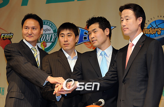 '2008-2009 동부프로미 프로농구' 플레이오프 미디어데이 기자회견이 25일 오후 서울 프라자 호텔에서 열렸다. 사상 처음으로 열린 이날 행사에는 오는 27일 시작되는 플레이오프에 진출한 모비스 동부 KCC 삼성 LG 전자랜드 감독과 선수 대표가 참석해 출사표와 각오 등을 밝혔다. 삼성 안준호 감독, 이상민과 LG 강을준 감독, 조상현이 선전을 다짐하는 포즈를 취하고 있다./윤민호 기자ymh@osen.co.kr