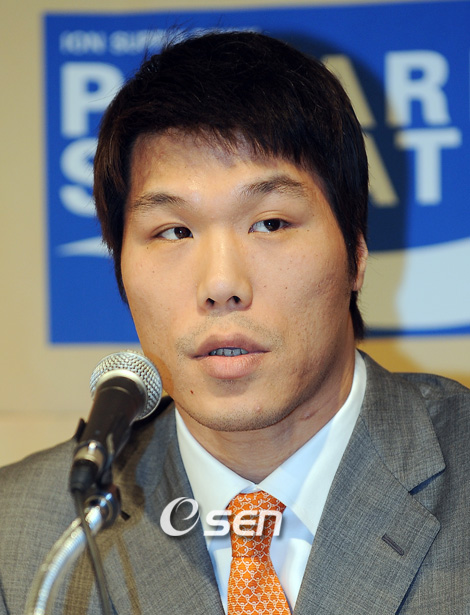 '2008-2009 동부프로미 프로농구' 플레이오프 미디어데이 기자회견이 25일 오후 서울 프라자 호텔에서 열렸다. 사상 처음으로 열린 이날 행사에는 오는 27일 시작되는 플레이오프에 진출한 모비스 동부 KCC 삼성 LG 전자랜드 감독과 선수 대표가 참석해 출사표와 각오 등을 밝혔다. 전자랜드 서장훈이 기자회견을 갖고 있다./윤민호 기자ymh@osen.co.kr