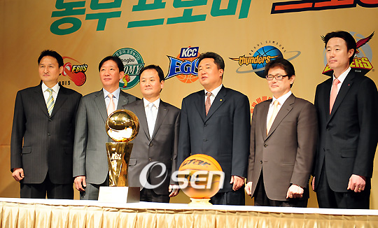 '2008-2009 동부프로미 프로농구' 플레이오프 미디어데이 기자회견이 25일 오후 서울 프라자 호텔에서 열렸다. 사상 처음으로 열린 이날 행사에는 오는 27일 시작되는 플레이오프에 진출한 모비스 동부 KCC 삼성 LG 전자랜드 감독과 선수 대표가 참석해 출사표와 각오 등을 밝혔다. 안준호 허재 유재학 전창진 최희암 강을준 감독이 포즈를 하고 있다./윤민호 기자ymh@osen.co.kr