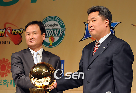 '2008-2009 동부프로미 프로농구' 플레이오프 미디어데이 기자회견이 25일 오후 서울 프라자 호텔에서 열렸다. 사상 처음으로 열린 이날 행사에는 오는 27일 시작되는 플레이오프에 진출한 모비스 동부 KCC 삼성 LG 전자랜드 감독과 선수 대표가 참석해 출사표와 각오 등을 밝혔다. 4강전에 직행한 모비스 유재학 감독과 동부 전창진 감독이 악수를 나누고 있다./윤민호 기자ymh@osen.co.kr