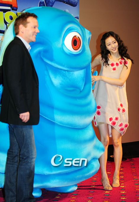 '몬스터 VS 에이리언' 언론 시사회가 26일 오전 서울 용산구 용산CGV에서 열렸다. 한국어 더빙판 주인공으로 참여한 배우 한예슬과 '워 딜러 장군' 역의 키퍼 서덜랜드, 드림웍스 CEO인 제프리 카젠버그가 무대인사를 가졌다.‘몬스터 VS 에이리언’은 거대한 몬스터들이 국가 수용소에 갇히게 되면서 벌어지는 해프닝을 그린 영화로 미국에서 3월 27일 개봉할 예정이다. 키퍼 서덜랜드와 한예슬이 몬스터 캐릭터와 포토타임을 갖고 있다./윤민호 기자ymh@osen.cokr