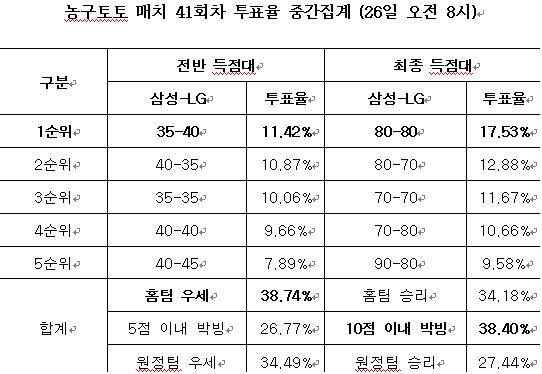[농구토토] 국내 프로농구 팬들은 오는 27일 벌어지는 서울삼성-안양LG전에서 양팀의 치열한 박빙승부를 점치고 있는 것으로 나타났다. 스포츠토토 공식 온라인 발매사이트인 베트맨(www.betman.co.kr)은 오는 27일(금) 오후 7시 잠실실내체육관에서 열리는 2008~2009 프로농구 플레이오프 첫 경기 삼성-LG전을 대상으로 한 농구토토 매치 41회차 투표율 중간집계 결과 38.40%가 양팀의 10점차 이내 접전을 전망했다고 밝혔다. 홈팀 삼성의 승리를 예상한 참가자는 34.18%로 집계됐고, 나머지 27.44%는 원정팀 LG의 승리에 투표했다. 최종 득점대에서는 80점-80점대로 10점이내에서 승부가 갈릴 것으로 예상한 참가자가 17.53%로 최다를 차지했다. 전반전 리드 예상에서는 삼성의 리드가 38.74%로 LG(34.49%)에 비해 근소한 우세를 지켰다. 전반전 득점대의 경우에는 40-35점대로 LG가 리드를 펼칠 것이라는 예상이 11.42%로 가장 높게 집계됐다. 스포츠토토 관계자는 “국내 농구팬들은 올 시즌 국내프로농구 플레이오프 첫 경기에서 삼성과 LG가 같은 점수대 박빙승부를 펼칠 것으로 전망했다” 며 “정규시즌 성적에서는 LG가 4승2패로 앞서있지만 삼성에는 국내 최정상급 가드 이상민을 비롯해 강혁, 이정석, 이규섭 등 노련한 선수들이 즐비하기 때문에 보다 신중한 판단이 요구된다” 고 말했다. 한편 이번 농구토토 매치 41회차 게임은 경기시작 10분 전인 오는 27일(금) 오후 6시 50분에 발매 마감된다. http://www.betman.co.kr">'즐거운 스포츠, 즐거운 토토'(http://www.betman.co.kr).