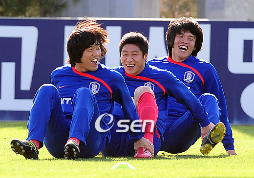 오는 4월 1일 서울월드컵구장에서 열리는 북한과의 2010 남아공월드컵 아시아 최종예선 5차전을 앞두고 태극전사들이 26일 파주 NFC에 소집됐다. 대표팀은 이에 앞서 28일 수원 월드컵구장에서 이라크와 평가전을 치른다. 오후 훈련에서 박주영 이근호 김창수가 한 조가 되어 뒤에 있는 선수의 발목을 잡고 앞으로 가는 훈련을 하며 웃고 있다./파주=손용호 기자spjj@osen.co.kr