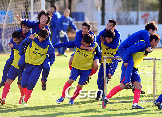 오는 4월 1일 서울월드컵구장에서 열리는 북한과의 2010 남아공월드컵 아시아 최종예선 5차전을 앞두고 태극전사들이 26일 파주 NFC에 소집됐다. 대표팀은 이에 앞서 28일 수원 월드컵구장에서 이라크와 평가전을 치른다. 미니골대 4개를 놓고 두 팀으로 나눠 경기를 해 진 팀이 이긴 팀을 업고 달리기를 하고 있다./파주=손용호 기자spjj@osen.co.kr