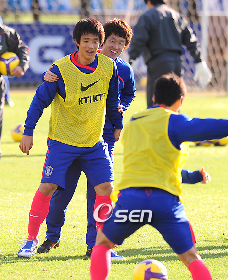 오는 4월 1일 서울월드컵구장에서 열리는 북한과의 2010 남아공월드컵 아시아 최종예선 5차전을 앞두고 태극전사들이 26일 파주 NFC에 소집됐다. 대표팀은 이에 앞서 28일 수원 월드컵구장에서 이라크와 평가전을 치른다. 미니 골대 4개를 놓고 두 팀으로 나누어 한 게임에서 박지성이 오범석을 뒤에서 잡으며 수비를 하고 있다./파주=손용호 기자spjj@osen.co.kr