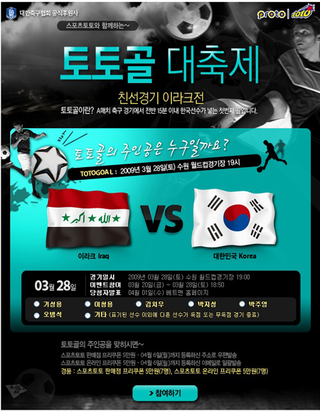 [축구토토]'한국-이라크전 토토골 주인공은 없다'. 대다수 축구팬들은 오는 28일 열리는 한국-이라크전에서 한국 대표팀이 전반 15분 이내 득점을 기록하기 힘들 것으로 내다봤다. 스포츠토토 공식 온라인 발매 사이트인 베트맨(www.betman.co.kr)은 오는 28일 오후 7시 수원 월드컵경기장에서 벌어지는 한국과 이라크의 평가전을 대상으로 한 토토골 이벤트 투표율 집계 결과, 전체 참가자의 56.64%가 전반 15분 이내 득점을 기록할 선수가 없을 것으로 예상했다고 밝혔다. 토토골 이벤트는 축구 국가대표팀 경기를 대상으로 한국팀 선수 가운데 전반 15분 이내 가장 먼저 득점을 기록할 선수를 알아맞히는 방식으로 진행된다. 이번 한-이라크전 토토골은 기성용, 이청용, 김치우, 박지성, 박주영, 오범석, 기타(15분내 득점자가 나오지 않는 경우 또는 다른 선수가 득점) 등 7가지 경우 가운데 하나를 선택하면 된다. 투표율 집계결과 27일 오전 현재 총 3690명의 참가자 가운데 모두 2090명(56.64%)이 기타를 선택했다. 이어서 박주영 539명(14.6%), 박지성 514명(13.93%), 기성용 284명(7.7%), 이청용 153명(4.1%), 김치우 84명(2.3%), 오범석 25명(0.6%) 순으로 투표율이 나타냈다. 베트맨 관계자는 "지난 해에 이어 진행되는 이번 토토골 이벤트에서도 축구팬의 참여 열기가 뜨겁다"며 "과연 이번 경기에서도 팬들의 예상대로 결과가 나올 것인지 관심을 모으고 있다"고 말했다. 한편 이번 '토토골' 이벤트의 당첨자 명단은 다음달 1일(수)에 베트맨 홈페이지(www.betman.co.kr)를 통해 발표된다. '즐거운 스포츠, 즐거운 토토'(http://www.betman.co.kr)