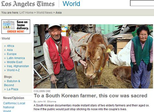 다큐멘터리 영화 ‘워낭소리’가 미국의 유력 일간지 LA 타임스의 1면을 장식했다. LA 타임스는 27일(현지시간) 1면 고정 기획기사란 ‘칼럼 원(one)’을 통해서 ‘한국의 농부에게 이 소는 신성한 존재였다(To a South Korean farmer, this cow was sacred)’는 제목으로 ‘워낭소리’ 흥행 성공과 이면의 아픔을 상세하게 소개했다. 이 신문은 ‘워낭소리’에 대해서 “영화 속 최원균 할아버지와 40년을 동고동락해 온 늙은 소와의 관계는 이삼순 할머니의 질투를 불러일으킬 정도로 감동적인 이야기”라고 전했다. “영화를 통해 한국 농촌의 가치와 동물에 대한 인간의 사랑, 그로 인한 동물의 충성 등 많은 메시지를 던져준 영화”라고 밝혔다. 그러나 신문은 “지난 1월 개봉된 영화가 인기를 끌면서 관광객들이 영화의 무대였던 산골 마을로 몰려 최 할아버지 내외의 조용한 생활을 위협하고 있다. ‘워낭소리’는 ‘다큐멘터리는 그것이 담고자 하는 대상을 위태롭게 할 수 있다’는 영화제작상의 교훈을 줬다"고 설명했다. crystal@osen.co.kr LA 타임스 홈페이지 캡처.
