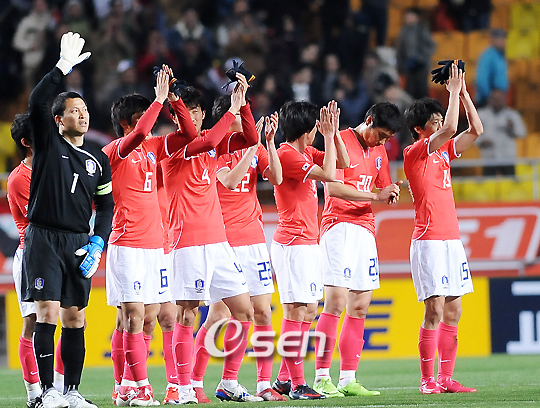 허정무 감독이 이끄는 한국 대표팀이 2010남아공월드컵 최종예선 5차전 북한과의 경기에 앞서 28일 오후 7시 수원월드컵경기장에서 이라크와 친선경기를 가졌다. 이 날 경기에서 한국은 이라크에게 김치우와 이근호의 연속골로 2-1 승리를 거뒀다. 경기를 마치고 한국 대표팀 선수들이 축구 팬들을 향해 인사를 하고 있다./수원=민경훈 기자 rumi@osen.co.kr