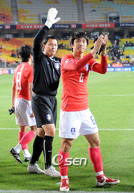 허정무 감독이 이끄는 한국 대표팀이 2010남아공월드컵 최종예선 5차전 북한과의 경기에 앞서 28일 오후 7시 수원월드컵경기장에서 이라크와 친선경기를 가졌다. 이 날 경기에서 한국은 이라크에게 김치우와 이근호의 연속골로 2-1 승리를 거뒀다. 경기를 마치고 한국 대표팀 이운재와 오범석이 인사를 하고 있다./수원=민경훈 기자 rumi@osen.co.kr