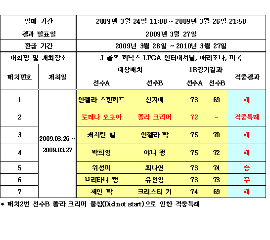 골프토토 승무패 14회차 적중결과… 총 1,237명 골프팬 7매치 승-무-패 맞혀 신지애, 안젤라 박, 위성미, 크리스티 커 ‘승’ 기록 [골프토토]J골프 피닉스 LPGA 인터내셔널 1라운드를 대상으로 한 골프토토 승무패 14회차 게임에서 총 1,237명의 적중자가 나왔다. 체육진흥투표권 수탁사업자인 스포츠토토(www.sportstoto.co.kr)는 지난 26일 미국 애리조나서 열린 미국여자프로골프(LPGA)투어 J골프 피닉스 LPGA 인터내셔널 1라운드를 대상으로 한 골프토토 승무패 14회차 게임에서 7개 매치를 정확히 맞힌 참가자가 1,237명 나와 각각 베팅 금액의 38.8배에 해당하는 적중상금을 가져가게 됐다고 밝혔다. 상금랭킹 순으로 14명을 선정, 2명씩 7개 매치로 나눠 각 매치별로 1라운드 최종 승-무-패를 예상하는 방식으로 진행된 이번 게임에서 안젤라 스탠퍼드-신지애(승), 로레나 오초아-폴라 크리머(폴라크리머 선수의 불참으로 인한 적중특례), 캐서린 헐-안젤라 박(패), 박희영-야니 챙(패), 위성미-최나연(승), 브리타니 랭-유선영(무), 제인 박-크리스티 커(패) 등의 결과가 나왔다. 각 매치의 승-무-패를 정확히 맞힌 적중자들 가운데 1만원을 베팅한 6명의 골프팬 들은 이번 회차 최고액인 38만 8,000원의 상금을 가져가는 기쁨을 맛보게 됐다. 또한 최소 베팅액인 100원을 베팅한 241명의 적중자들에게는 각각 3,880원의 상금이 각각 지급된다. 한편 골프토토 승무패 15회차 게임은 KPGA 한-중투어 KEB인비테이셔널 대회를 대상으로 시행될 예정이다. '즐거운 스포츠, 즐거운 토토'(http://www.betman.co.kr)
