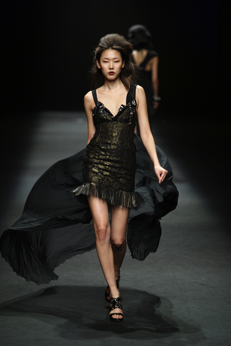 감각적인 디자인으로 명성을 얻고 있는 디자이너 곽현주(Gissen)가 09/10 F/W 서울패션위크(SEOUL FASHION WEEK)에서 개성 넘치는 무대를 선보이고 있다. 국내는 물론 해외에서 이름을 떨치고 있는 모델 김원경과 한혜진의 국내 무대 컴백으로 화제를 모았던 이번 패션쇼는 국내 패션쇼에서 실력을 인정받은 루앤미디어가 연출을 맡았다. 이번 컬렉션의 테마는 ‘다크니스’로 현실 속에서 뱀파이어를 만난 듯 중성적이면서도 극도로 여성스러운 스타일을 추구하고 있다. 어둠에서 느껴지는 완벽함, 비밀스러움의 ‘블랙 로망스’가 무대 위에서 표현돼 눈길을 사로잡았다. /OSEN=생활경제팀 osenlife@osen.co.kr