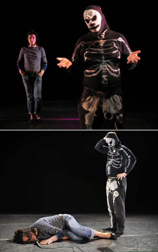 ‘페스티벌 봄(Bo:m)’…영국, 팀 이첼스의 포스드 엔터테인먼트 ‘스펙타큘라’ 당신은 배우들의 '연기'를 믿는가? '죽음'을 경험해보지 못한 배우들이 '죽음'을 연기한다. 진짜 '죽음'이란 것이 이런 것일까? 연극의 언어와 형식에 파격적인 변혁을 가해온 영국의 팀 이첼스(Tim Etchells)가 이끄는 포스드 엔터테인먼트가 실험적인 공연을 한국무대에 펼친다. 2009년‘페스티벌 봄’의 화려한 무대로 연극과 퍼포먼스가 결합된 복합장르 작품의 ‘스펙타큘라’를 선보인다. 영국의 포스드 엔터테인먼트는 ‘포스트드라마틱 시어터’의 선각자로 평가받는 당대 최고의 실험극단이다. 영화와 음악, 문학과 시각미술의 경계를 초월하는 즉흥적인 표현들로 기발한 창의력과 집중적인 토론으로 이뤄지는 공동 작업으로 작품이 완성됐다. ‘스펙타큘라’ 무대에는 해골 의상을 한 배우가 죽음을 연기하는 여배우 옆에서 이죽거린다. 불안에 앞서 우리를 자극하는 것은 죽음에 대한 통념과 식상한 기억들이다. 고상한 멜로드라마와 부조리한 유머 사이에서 창출되는 유희에 대해 기존 예술의 통념을 뒤엎는다. 무대에 등장한 해골 의상의 배우는 광대 같은 재치와 변덕으로 죽음을 재현한다. 죽음의 연극무대는 제대로 된‘죽음’을 재현하고 있는 것인가? 이들이 표현하는 연극의 ‘연기’는 무엇이며, 관객은 이들이 말하는 ‘죽음’을 믿어야 하는 것인가? 작품은 ‘죽음’에 대한 ‘현재성’을 벗어나 연극무대를 의심케 한다. ‘퀴즐라!’를 통해 백남준아트센터에서 공연된 바 있는 영국의 포스드 엔터테인먼트는 예술감독인 팀 이첼스(Tim Etchells)와 디자이너 리차드 로우든(Richard Lowdon), 그리고 연기를 맡는 로빈 아서(Robin Arthur), 클레어 마샬(Claire Marshall), 캐시 네이든(Cathy Naden), 테리 오코너(Terry O'Connor) 등 모두 여섯 명의 앙상블로 구성돼 있다. 한국공연을 위해 두 번째 내한한 포스드 엔터테인먼트 앙상블은 ‘페스티벌 봄(Bo:m)’에 참가하기 위해 배우 2명과 제작 기술팀 1명을 포함해 3명이 내한했다. 이번 공연에는 로빈 아서(Robin Arthur), 클레어 마샬(Claire Marshall)의 연기로 펼쳐진다. 영국의 ‘스펙타큘라’는 3월 31일과 4월 1일 아르코예술대극장에서 공연된다. jin@osen.co.kr ‘페스티벌 봄(Bo:m)’의 ‘스펙타큘라’.