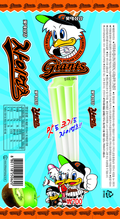 롯데 자이언츠의 로고와 마스코트가 삽입된 아이스바인 '자이언츠 바'가 31일 출시됐다. 롯데삼강이 출시한 '자이언츠 바'는 국내에서 판매되는 아이스바 가운데 가장 큰 용량인 100ml를 자랑한다. 또한 사과맛 주스 코팅에 속은 키위맛으로 채워져 있고 포장지는 갈매기 마스코트 누리, 아라, 피니가 들어간 귀여운 디자인이다. 한편 판매가는 700원이며 부산 및 경남지역에서만 판매된다. what@osen.co.kr 롯데 자이언츠 제공.