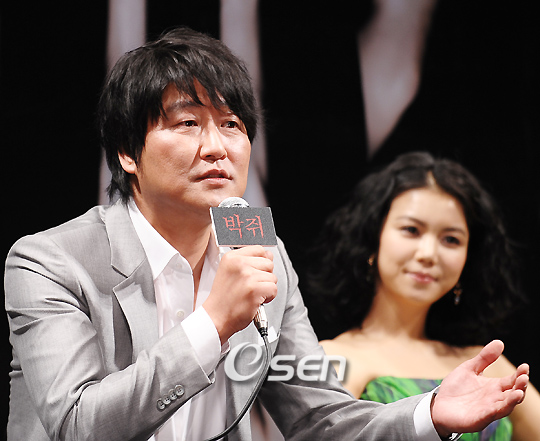 박찬욱 감독의 신작 영화 '박쥐' 제작보고회가 31일 서울 압구정 CGV에서 열렸다. 이 자리에는 박찬욱 감독과 주연배우 송강호 김옥빈이 참석했다. 내달 30일 개봉예정인 이 영화는 정체불명의 피를 수혈 받고 뱀파이어가 된 신부(송강호)가 친구의 아내(김옥빈)와 치명적인 사랑에 빠져 남편을 살해하자는 그녀의 제안을 받아들이면서 예상치 못한 상황에 휘말리게 되는 내용을 담고 있다. 송강호가 기자회견을 하고 있다./민경훈 기자 rumi@osen.co.kr