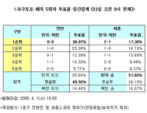 [축구토토] 스포츠토토 공식 온라인 발매 사이트인 베트맨(www.betman.co.kr)은 오는 1일(수) 오후 8시(한국시간) 서울 월드컵경기장에서 펼쳐지는 한국과 북한의 2010년 남아프리카공화국 월드컵 아시아지역 최종예선전을 대상으로 한 축구토토 매치 5회차 투표율 분석 결과 국내 축구팬들은 한국의 우세를 점치고 있는 것으로 나타났다고 밝혔다. 이들 축구토토 매치 참가자들 중 57.83%가 한국의 승리를 예상했으며 북한의 승리에는 28.10%가, 무승부에는 14.07%가 투표했다. 이란(홈)-한국(원정)의 전반 및 최종 스코어를 알아 맞히는 방식으로 진행되는 이번 회차에서 최종 스코어별 투표율을 살펴보면 한국(2점)-북한(1점) 17.30%, 한국(1점)-북한(0점) 14.73%, 한국(1점)-북한(1점) 13.89%, 한국(2점)-북한(0점) 9.44%등의 순으로 집계됐다. 전반전 스코어의 경우는 한국(0점)-북한(0점) 예상이 38.87%로 가장 많았으며 그 뒤를 이어 한국(1점)-북한(0점) 25.24%, 한국(0점)-북한(1점) 12.39%, 한국(1점)-북한(1점) 10.33%였다. 베트맨 관계자는 “축구팬들은 지난 이라크와의 평가전을 역전승으로 이끌며 조직력과 컨디션을 가다듬은 한국 대표팀이 지난해부터 계속된 북한과의 연속 무승부를 끊을 것으로 기대하고 있다”며 “박지성, 이영표, 박주영과 최근 프리머어리그 위건에 입단한 조원희 등 해외파가 가세한 한국팀이 북한의 견고한 수비벽을 뚫을 수 있을 지가 한 관전 포인트가 될 것”이라고 말했다. 한편, 이번 축구토토 매치 5회차는 1일(수) 오후 7시 50분 발매 마감된다. http://www.betman.co.kr">'즐거운 스포츠, 즐거운 토토'(http://www.betman.co.kr).