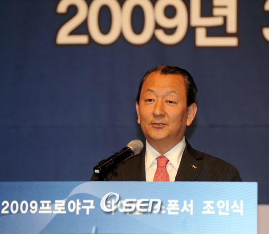 CJ인터넷(대표이사:정영종)과 한국야구위원회(총재:유영구)는 31일 서울 신라호텔에서 프로야구 타이틀 스폰서 조인식을 갖고 엠블럼과 야구 사랑 캠페인 '야구가좋아'를 발표했다. 이날 조인식에서 CJ인터넷은 첫 해 35억등 계약 기간 3년의 타이틀 스폰서 계약을 체결하고 프로야구 후원을 결정했다.이로써 올해 한국 프로야구의 공식 명칭은 '2009 CJ 마구마구 프로야구'로 정해졌다. 유영구 총재가 인사말을 하고 있다./신라호텔=김영민 기자ajyoung@osen.co.kr