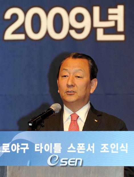 CJ인터넷(대표이사:정영종)과 한국야구위원회(총재:유영구)는 31일 서울 신라호텔에서 프로야구 타이틀 스폰서 조인식을 갖고 엠블럼과 야구 사랑 캠페인 '야구가좋아'를 발표했다. 이날 조인식에서 CJ인터넷은 첫 해 35억등 계약 기간 3년의 타이틀 스폰서 계약을 체결하고 프로야구 후원을 결정했다.이로써 올해 한국 프로야구의 공식 명칭은 '2009 CJ 마구마구 프로야구'로 정해졌다. 유영구 총재가 인사말을 하고 있다./신라호텔=김영민 기자ajyoung@osen.co.kr
