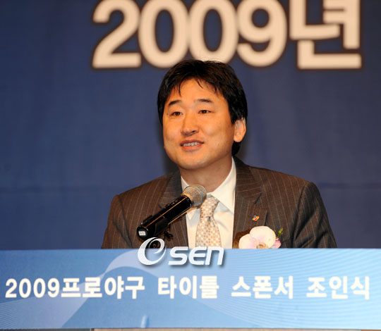 CJ인터넷(대표이사:정영종)과 한국야구위원회(총재:유영구)는 31일 서울 신라호텔에서 프로야구 타이틀 스폰서 조인식을 갖고 엠블럼과 야구 사랑 캠페인 '야구가좋아'를 발표했다. 이날 조인식에서 CJ인터넷은 첫 해 35억등 계약 기간 3년의 타이틀 스폰서 계약을 체결하고 프로야구 후원을 결정했다.이로써 올해 한국 프로야구의 공식 명칭은 '2009 CJ 마구마구 프로야구'로 정해졌다. 정영종 대표가 인사말을 하고 있다./신라호텔=김영민 기자ajyoung@osen.co.kr
