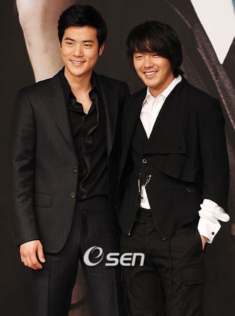 KBS 2TV 새 월화드라마 '남자 이야기'의 제작 발표회가 31일 오후 서울 광장동 쉐라톤 워커힐 무궁화 홀에서 열렸다. 이 자리에는 윤성식 연출과 배우 박용하 김강우 박시연 이필립 김뢰하 박기웅 한여운 김강우가 참석했다. 내 달 6일 첫방송 예정인 이 드라마는 돈이 전부인 세상에 의해 버려진 한 남자가 세상을 향해 선전포고를 하는 내용을 담고 있다. 기자회견을 마치고 김강우와 박용하가 포토타임을 갖고 있다./민경훈 기자 rumi@osen.co.kr