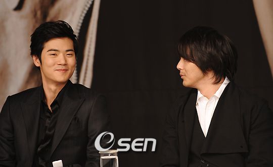 KBS 2TV 새 월화드라마 '남자 이야기'의 제작 발표회가 31일 오후 서울 광장동 쉐라톤 워커힐 무궁화 홀에서 열렸다. 이 자리에는 윤성식 연출과 배우 박용하 김강우 박시연 이필립 김뢰하 박기웅 한여운 김강우가 참석했다. 내 달 6일 첫방송 예정인 이 드라마는 돈이 전부인 세상에 의해 버려진 한 남자가 세상을 향해 선전포고를 하는 내용을 담고 있다. 기자회견 중 김강우와 박용하가 즐겁게 얘기를 나누고 있다./민경훈 기자 rumi@osen.co.kr