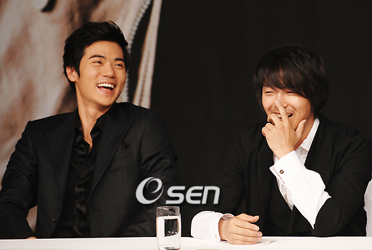 KBS 2TV 새 월화드라마 '남자 이야기'의 제작 발표회가 31일 오후 서울 광장동 쉐라톤 워커힐 무궁화 홀에서 열렸다. 이 자리에는 윤성식 연출과 배우 박용하 김강우 박시연 이필립 김뢰하 박기웅 한여운 김강우가 참석했다. 내 달 6일 첫방송 예정인 이 드라마는 돈이 전부인 세상에 의해 버려진 한 남자가 세상을 향해 선전포고를 하는 내용을 담고 있다. 기자회견 중 김강우와 박용하가 환하게 웃고 있다./민경훈 기자 rumi@osen.co.kr