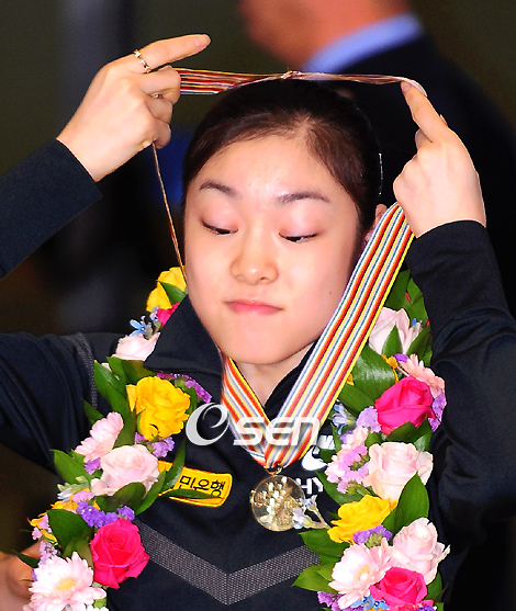 세계피겨선수권대회에서 여자 선수로는 최초로 꿈의 200점을 돌파하며 금메달을 거머쥔 김연아가 31일 인천공항으로 귀국했다. 김연아는 미국 캘리포니아주 로스앤젤레스 스테이플스 센터에서 열린 2009 국제빙상경기연맹(ISU) 세계피겨선수권대회 여자 싱글 프리스케이팅에서 131.59점을 기록, 쇼트프로그램에서 역대 최고점인 76.12점과 함께 총점 207.71점을 획득했다. 김연아가 취재진을 위해 금메달을 목에 걸고 있다./인천공항=손용호 기자spjj@osen.co.kr