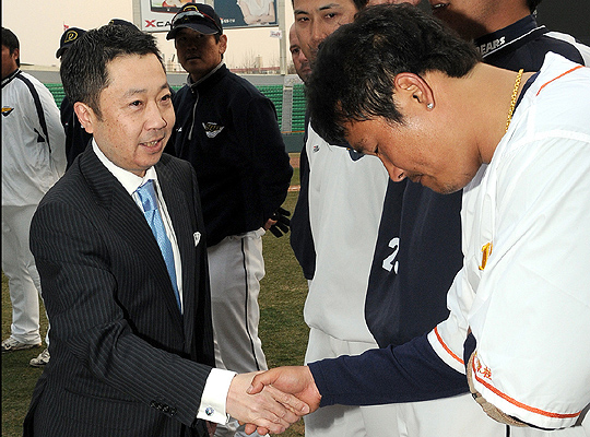 두산 베어스 박정원(朴廷原) 구단주가 31일(화), 오후 5시 잠실야구장을 방문했다. 이날 박정원(朴廷原) 구단주는 잠실야구장에서 연습 중이던 김경문 감독 이하 코칭스태프와 선수들을 격려하고, 올해도 최선을 다하는 허슬플레이로 재미있고 팬들에게 감동을 주는 경기를 해줄 것을 당부했다. 박정원(朴廷原) 구단주는 지난 3월 13일(금) 두산베어스의 구단주로 취임한 바 있다. 두산 베어스 제공