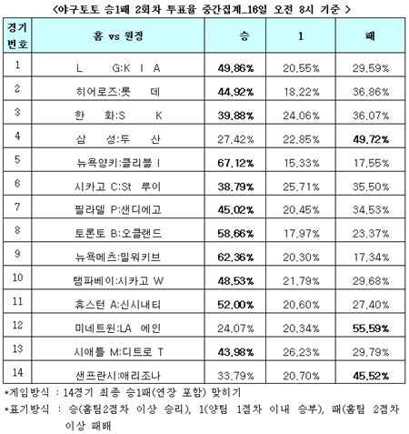 [야구토토]국내 야구팬들은 국내프로야구 히어로즈가 롯데에 우세한 경기를 펼칠 것이라 전망했다. 스포츠토토 온라인 발매사이트인 베트맨(www.betman.co.kr)은 오는 17일부터 18일(이하 한국시간)까지 벌어지는 국내프로야구 4경기, 미국프로야구 MLB 10경기 등 총 14경기를 대상으로 한 야구토토 승1패 2회차 투표율 중간집계 결과, 전체 참가자의 절반에 가까운 44.92%가 시즌 초반 폭발적인 타력을 자랑하고 있는 히어로즈가 롯데를 누르고 기세를 이어갈 것으로 내다봤다. 지난 시즌 돌풍을 일으킨 롯데의 승리에 투표한 참가자는 36.86%로 집계됐으며, 나머지 18.22%는 양팀의 1점차의 박빙승부를 전망했다. LG-KIA(1경기)전을 비롯해 한화-SK(3경기)전, 삼성-두산(4경기)전은 각각 LG(49.86%)와 한화(39.88%), 두산(49.72%)의 우세에 투표한 참가자가 많았다. ▲뉴욕양키스, 추신수의 클리블랜드에 완승 거둘 것 미국프로야구(MLB)에서는 아메리칸리그 전통의 강자 뉴욕양키스(67.12%)가 추신수가 활약하고 있는 클리블랜드(17.55%)에 완승을 거둘 것이라는 전망이 다수를 차지했다. 아메리칸리그 동부와 서부에서 각각 1위를 달리고 있는 토론토(58.66%)와 시애틀(43.98%)은 오클랜드(23.37%)와 디트로이트(29.79%)를 상대로 승수 쌓기에 성공할 것이라는 예상이 많았다. 이밖에 탬파베이(48.53%)와 LA에인절스(55.59%)가 아메리칸리그에서 우세한 경기를 펼칠 팀으로 꼽혔다. 내셔널리그에서는 뉴욕메츠(62.36%)와 휴스턴(52.00%), 애리조나(45.52%)가 각각 밀워키(17.34%), 신시내티(27.40%), 샌프란시스코(33.79%)를 상대로 승리를 거둘 것으로 예상한 비율이 높게 집계됐다. 반면 시카고 컵스-세인트루이스(6경기)전은 홈팀 시카고 컵스(38.79%)와 원정팀 세인트루이스(35.50%)의 투표율이 거의 비슷해 이번 회차 최고의 박빙승부를 예고했다. 한편 이번 야구토토 승1패 2회차 게임은 첫번째 경기 시작 10분전인 17일 오후 6시 20분에 발매를 마감한다. '즐거운 스포츠, 즐거운 토토'(http://www.betman.co.kr)