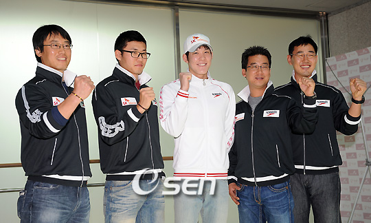 '마린 보이' 박태환(20)이 6주간의 미국 2차 전지훈련을 위해 16일 오후 인천공항을 통해 미국 LA USC(남가주대학교)로 떠난다. 박태환은 USC 수영팀의 데이브 살로 감독의 지도로 7월 로마에서 열리는 2009 세계선수권대회에서 자유형 400m 우승과 1500m 기록 단축을 목표로 한다. 박태환이 훈련전담팀과 기념 촬영을 하고 있다./인천공항=윤민호 기자ymh@osen.co.kr