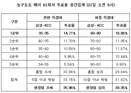 [농구토토]국내 프로농구 팬들은 전주 KCC의 근소한 우세를 점치고 있다. 스포츠토토 공식 온라인 발매사이트인 베트맨(www.betman.co.kr)은 오는 22일 오후 7시 잠실실내체육관에서 열리는 2008~2009 프로농구 챔피언결정전 3차전 삼성-KCC전을 대상으로 한 농구토토 매치 61회차 투표율 중간집계 결과, 38.35%가 원정팀 KCC의 근소한 우세를 전망했다고 밝혔다. 홈팀 삼성의 승리를 예상한 참가자는 29.84%로 집계됐고 나머지 31.82%는 양팀의 10점차 이내 접전에 투표했다. 최종 득점대에서는 80점-80점대로 10점이내에서 승부가 갈릴 것으로 예상한 참가자가 16.86%로 최다를 차지했다. 전반전 리드 예상에서는 KCC의 리드가 35.96%로 삼성(30.86%)에 비해 다소 높게 나타났다. 전반전 득점대의 경우에는 35-35점대로 양팀이 5점차 이내 접전을 펼칠 것이라는 예상이 14.71%로 가장 높게 집계됐다. 스포츠토토 관계자는 "국내 농구팬들은 챔피언결정전 3차전에서 하승진을 앞세운 원정팀 KCC의 우세를 전망했다"며 "특히 올 시즌 벌어진 플레이오프 홈경기에서 한번도 패한 적이 없는 삼성이 과연 기록을 이어갈 수 있을지 농구팬들의 관심이 집중되고 있다"고 말했다. 한편 이번 농구토토 매치 61회차 게임은 경기시작 10분 전인 오는 22일(수) 오후 6시 50분에 발매 마감된다. '즐거운 스포츠, 즐거운 토토'(http://www.betman.co.kr)