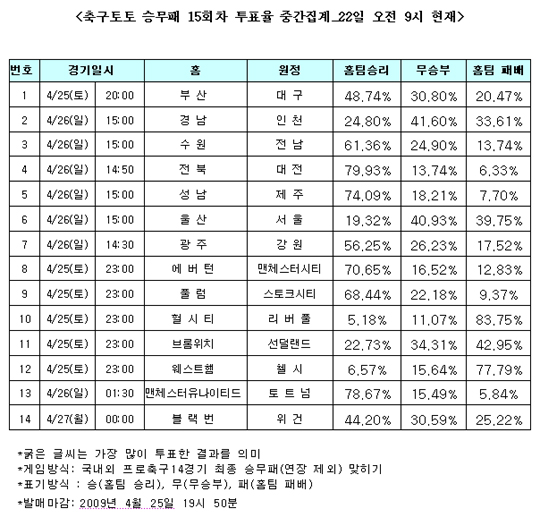 [축구토토]국내 축구팬들은 이번 주말 프리미어리그에서 맨체스터 유나이티드(이하 맨유)가 토트넘에 승리를 할 가능성이 높다고 점쳤다. 스포츠토토 온라인 발매사이트인 베트맨(www.betman.co.kr)은 오는 25일부터 27일 새벽(한국시간)까지 벌어지는 K-리그 7경기와 잉글랜드 프리미어리그 7경기 등 총 14경기를 대상으로 한 축구토토 승무패 15회차 투표율 중간집계 결과, 프리미어리그 맨유-토트넘전에서 축구팬 78.67%가 홈팀 맨유의 승리를 예상했다고 밝혔다. 반면 원정팀 토트넘의 승리 예상은 5.84%였으며 두 팀의 무승부 예상도 15.49%에 그쳤다. 이번 경기에서는 빡빡한 경기 일정과 주전 선수들의 컨디션 난조로 최근 FA컵 결승 진출에 실패한 맨유가 강팀에 강한 면모를 보이는 토트넘을 맞아 승리를 거두고 리버풀과 첼시와의 선두 경쟁에서 우위를 점할 수 있을 지가 흥미로운 관전 포인트다. 또한 헐 시티와 리버풀전에서는 리버풀의 승리 83.75%, 헐시티 승리 5.18%, 무승부 11.07%의 예상 비율을 보여 리버풀의 우세를 예상하는 축구팬들의 압도적으로 많았다. 이밖에 축구팬들은 K-리그 전북-대전, 성남-제주, 광주-강원전에서 전북 승리(79.93%), 성남 승리(74.09%), 광주 승리(56.25%)의 가능성을 각각 높게 예상했다. 한편 이번 축구토토 승무패 15회차는 오는 25일 오후 7시 50분에 발매 마감되며 모든 경기가 종료된 27일 결과가 공식 발표된다. '즐거운 스포츠, 즐거운 토토'(http://www.betman.co.kr)