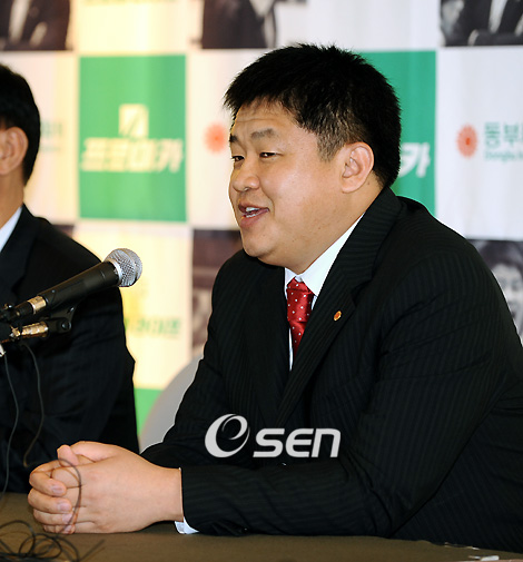 원주 동부프로미 프로농구단 강동희 신임 감독취임 기자회견이 27일 서울 소공동 플라자호텔에서 열렸다. 강동희 감독이 허,동,택 트리오와 함께 지도자 생활을 하게 되어 기쁘게 생각하며 선배들과 경기를 펼치며 배울 점은 배우고 도전할 부분은 도전하는 자세로 하면 좋은 결과를 얻지 않을까 생각한다며 취재진의 질문에 답변을 하고 있다./김영민 기자 ajyoung@osen.co.kr