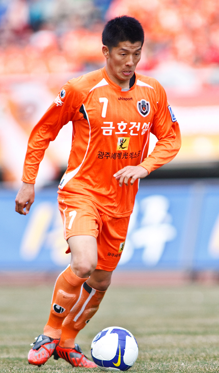 "태극마크를 간절히 원한다". 올 시즌 초특급 활약(5골 2도움)으로 광주 상무의 리그 선두(5승 1무 1패)를 이끌고 있는 김명중(24)이 담대한 포부를 밝혔다. 지난 26일 리그 7라운드 강원 FC와 경기서 두 차례나 골문을 갈라 팀의 4연승을 이끈 뒤 꿀맛 같은 2박 3일 휴가를 즐기고 있는 김명중은 27일 전화통화를 통해 상승세의 이유와 앞으로 포부 등 다양한 이야기를 들려주었다. 김명중은 2005년 포항 스틸러스에 입단해 3년 동안 32경기에 나섰음에도 공격포인트가 전혀 없었지만 광주로 적을 옮긴 뒤 지난해 31경기서 7득점 2도움의 빼어난 활약을 보인 것을 포함 벌써 12골 4도움을 기록하고 있다. 이에 김명중은 "이강조 감독님께서 미드필더에서 공격수로 보직을 변경시켜준 것이 컸다. 올 시즌 팀에 합류한 (최)성국이 형이 수비를 많이 끌고 다녀 내게 더 많은 기회가 생기는 것 같다. 경기도 오산에 살고 계신 부모님이 항상 경기장을 찾아주신다. '최고가 될 수 있다'는 아버지의 격려가 큰 힘이 됐다"며 가족과 동료에게 공을 돌렸다. 오는 10월 예비역 마크를 달고 전역하는 김명중은 올해 말이면 FA(자유계약선수)로 풀리게 된다. 이에 김명중은 "입대 전 3년 동안 나를 선택해준 포항에 해준 게 없다. 기회가 주어진다면 포항에 남고 싶다. 이동국(전북) 조원희(위건) 정경호(강원)같은 선배들처럼 제대 후 팀에 큰 보탬이 되고 싶다"며 의리를 보여주기도 했다. 이어 김명중은 "2005 네덜란드 세계청소년대회를 앞두고 피로골절 수술로 대표팀 유니폼을 벗을 수 밖에 없었다. 이왕이면 가장 높은 곳을 노려보고 싶다. 축구화를 신은 이상 태극마크는 인생에 있어서 가장 큰 목표"라는 청사진을 들려주었다. '실패가 무서워서, 지는 게 겁이 나서 도전조차 하지 않는다면 그게 지는 것'이라고 자신의 미니홈피에 적어 놓은 글귀처럼 김명중은 올 시즌 목표인 10골을 향해 도전을 멈추지 않고 있다. parkrin@osen.co.kr 광주 상무 제공.