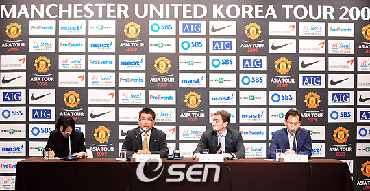 오는 7월 24일 서울 월드컵경기장서 벌어질 맨체스터 유나이티드와 FC 서울의 친선경기 기자회견이 29일 서울 신라호텔에서 열렸다. 맨유 아시아투어 주관사인 프로이벤트의 폴 제이 캄 사장, 맨유의 로빈 데이빗 제임스 아시아 마케팅 매너저, 방한경기 프로모터인 마스트엔터테인먼트의 김용관 대표가 기자회견을 갖고 있다./윤민호 기자ymh@osen.co.kr