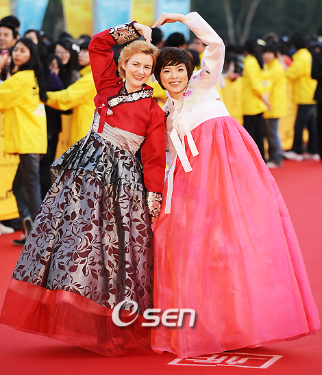 제 10회 전주국제영화제(JIFF) 개막식의 레드카펫 행사가 30일 오후 전라북도 전주시 한국 소리문화의 전당에서 열렸다. 이 영화제는 내달 8일까지 앞으로 9일간 화려한 영화축제의 장을 열며 세계 42개국 200여 편의 영화가 전주시 고사동 영화의 거리 극장가 등 15개 극장에서 상영된다. '미녀들의 수다' 미르야(왼쪽)과 허이령이 손으로 하트를 그리며 레드카펫 위에서 포즈를 취하고 있다./전주=민경훈 기자 rumi@osen.co.kr