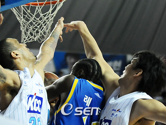 '2008-2009 동부 프로미 프로농구' 챔피언결정전 7차전 전주 KCC와 서울 삼성의 경기가 1일 전주 실내체육관에서 벌어졌다. 양팀은 3승3패로 마지막 7차전에서 우승 트로피를 놓고 결전을 벌였다. 역대 챔피언결정전이 7차전까지 간 경우는 5번째다. 1쿼터 삼성 레더가 레이업슛을 시도할 때 KCC 브랜드와 하승진이 동시에 블로킹하고 있다./전주=민경훈 기자 rumi@osen.co.kr