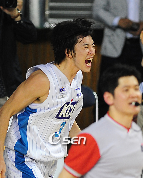 '2008-2009 동부 프로미 프로농구' 챔피언결정전 7차전 전주 KCC와 서울 삼성의 경기가 1일 전주 실내체육관에서 벌어졌다. 양팀은 3승3패로 마지막 7차전에서 우승 트로피를 놓고 결전을 벌였다. 역대 챔피언결정전이 7차전까지 간 경우는 5번째다. 2쿼터 KCC 강병현이 3점짜리 버저비터를 성공시키고 환호하고 있다./전주=손용호 기자spjj@osen.co.kr