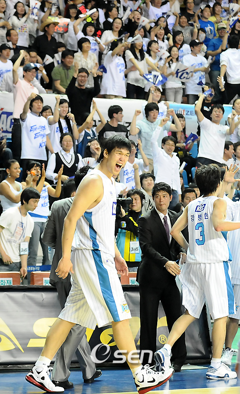 '2008-2009 동부 프로미 프로농구' 챔피언결정전 7차전 전주 KCC와 서울 삼성의 경기가 1일 전주 실내체육관에서 벌어졌다. 양팀은 챔피언 결정전 3승 3패로 마지막 7차전에서 우승 트로피를 놓고 결전을 벌였다. 역대 챔피언결정전이 7차전까지 간 경우는 5번째다. 2쿼터 종료 직전 KCC 강병현의 역전 버저비터가 터지자 KCC 팬들과 하승진, 강병현이 크게 기뻐하고 있다./전주=민경훈 기자 rumi@osen.co.kr