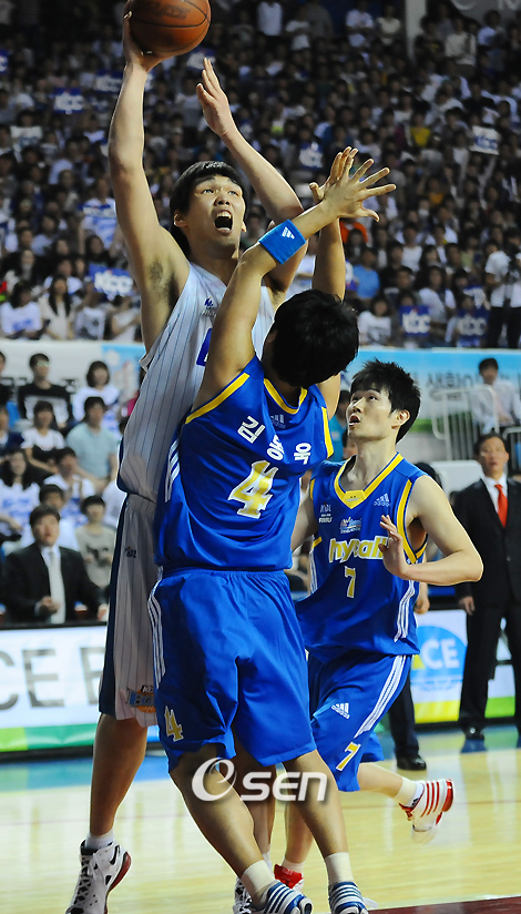 '2008-2009 동부 프로미 프로농구' 챔피언결정전 7차전 전주 KCC와 서울 삼성의 경기가 1일 전주 실내체육관에서 벌어졌다. 양팀은 챔피언 결정전 3승 3패로 마지막 7차전에서 우승 트로피를 놓고 결전을 벌였다. 역대 챔피언결정전이 7차전까지 간 경우는 5번째다. 3쿼터 KCC 하승진이 삼성 김동욱과 부딪히며 슛을 성공시키고 있다. /전주=민경훈 기자 rumi@osen.co.kr