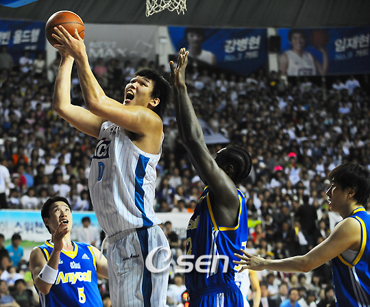 '2008-2009 동부 프로미 프로농구' 챔피언결정전 7차전 전주 KCC와 서울 삼성의 경기가 1일 전주 실내체육관에서 벌어졌다. 양팀은 챔피언 결정전 3승 3패로 마지막 7차전에서 우승 트로피를 놓고 결전을 벌였다. 역대 챔피언결정전이 7차전까지 간 경우는 5번째다. 3쿼터 KCC 하승진이 삼성 이정석 레더 이상민의 블로킹을 뚫고 슛을 쏘고 있다. /전주=민경훈 기자 rumi@osen.co.kr
