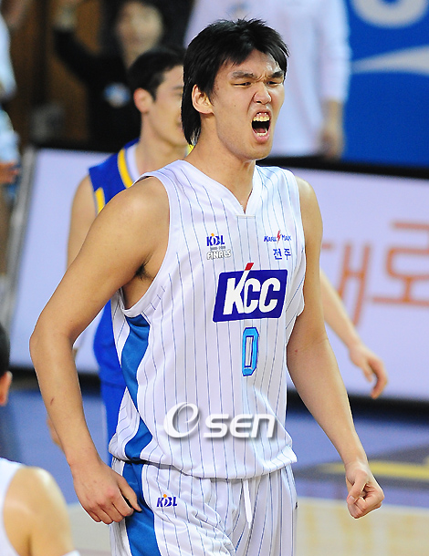 '2008-2009 동부 프로미 프로농구' 챔피언결정전 7차전 전주 KCC와 서울 삼성의 경기가 1일 전주 실내체육관에서 벌어졌다. 양팀은 3승3패로 마지막 7차전에서 우승 트로피를 놓고 결전을 벌였다. 역대 챔피언결정전이 7차전까지 간 경우는 5번째다. 3쿼터 KCC 하승진이 슛을 성공시키고 환호하고 있다./전주=손용호 기자spjj@osen.co.kr