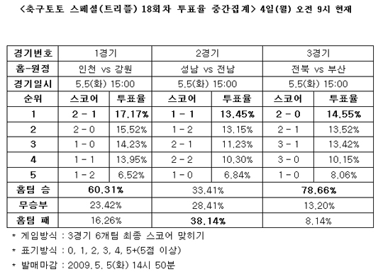 [축구토토]스포츠토토 공식 온라인 발매 사이트인 베트맨(www.betman.co.kr)는 어린이날인 오는 5일 열리는 인천-강원, 성남-전남, 전북-부산전 등 K-리그 컵 대회 3경기를 대상으로 한 축구토토 스페셜 18회차 투표율 중간집계 결과, 전북-부산전에서 참가자의 대다수인 78.66%가 리그에서 무패로 선두를 달리고 있는 홈팀 전북의 승리를 예상했다고 밝혔다. 원정팀 부산의 승리 예상은 8.14%에 머물렀고 두 팀의 무승부에는 13.20%의 축구팬들이 투표해 대다수의 축구팬들이 최근 상승세를 타고 있는 전북의 승리를 높게 점쳤다. 최종 스코어 예상의 경우 2-0 전북 승리가 14.55%로 가장 높은 비율을 보였다. 1경기 인천-강원전의 경우는 인천의 승리 예상이 60.31%, 강원 승리 16.26%, 무승부 23.42%의 투표율을 보여 인천이 강원의 돌풍을 잠재울 것이라는 전망이 많았다. 최종 스코어 예상은 2-1 인천 승리가 17.17%로 1순위를 차지했다. 2경기 성남-전남전에서는 원정팀 전남의 승리(38.14%)와 홈팀 성남(33.41%)의 투표율이 거의 비슷하게 집계돼 우열을 가리기 힘든 접전이 펼쳐질 것으로 나타났다. 최종 스코어별 투표율은 1-1 무승부가 13.45%로 가장 높았다. 한편 이번 축구토토 스페셜 18회차 게임은 첫번째 경기 시작 10분 전인 5일(화) 오후 2시 50분에 발매 마감된다. '즐거운 스포츠, 즐거운 토토'(http://www.betman.co.kr)
