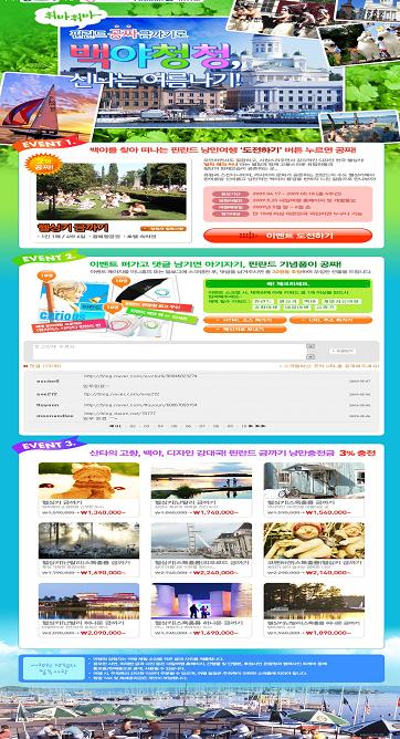 내일여행, ‘백야청청 핀란드 공짜 금까기’ 이벤트 실시 ‘발틱해의 처녀’라는 별칭과 함께 고풍스러운 유럽의 전통과 첨단의 현재 모습이 공존하는 핀란드. 한여름 밤 신비로운 백야의 풍경과 함께 달콤한 휴식을 즐길 수 있는 핀란드는 누구나 꿈꾸는 여행지다. 내일여행이 핀란드로의 낭만여행을 원하는 여행객들을 위해 ‘백야청청 핀란드 공짜 금까기’ 이벤트를 오는 18일까지 진행한다. 이벤트 참여방법은 내일여행 홈페이지(www.naeiltour.co.kr) 내 이벤트 페이지에 접속한 뒤 ‘백야청청 핀란드 공짜 금까기’ 코너에 간단한 자기소개와 핀란드에서 하고 싶은 일을 작성하면 된다. 당첨은 오는 25일 홈페이지에서 확인할 수 있으며 당첨자 2명은 이달말에서 6월초 사이에 4박6일간의 핀란드 여행을 즐기게 된다. 또한 내일여행은 이번 이벤트를 개인 홈페이지에 스크랩하는 블로거를 추첨해 핀란드 관광청에서 제공하는 기념품을 증정한다. 기념품은 세계 문화 체험 프로젝트 ‘큐리어스 시리즈’ 핀란드편 10명, 핀란드 관광청 로고가 새겨진 우산 10명, 핀란드 에코백 또는 티셔츠 10명 등 총 30명에게 제공된다. 여행미디어 박현영 기자 phy@tourmedia.co.kr