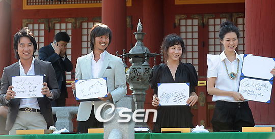 MBC 월화 드라마 '선덕여왕' 세트장 오픈식이 경주시 신라밀레니엄파크에서 열렸다. 우리나라 최초의 여성 임금인 선덕여왕의 이야기를 다루고 있는 드라마이며 덕만공주가 온갖 시련과 시험을 거쳐 우리나라 최초의 여왕이자 신라 제27대 왕인 선덕여왕 자리에 오르기까지의 과정을 생동감 있게 그린 작품이다. 엄태웅 김남길 박예진 이요원 김남길이 자신의 사인을 들고 기념촬영을 하고 있다./경주=윤민호 기자ymh@osen.co.kr